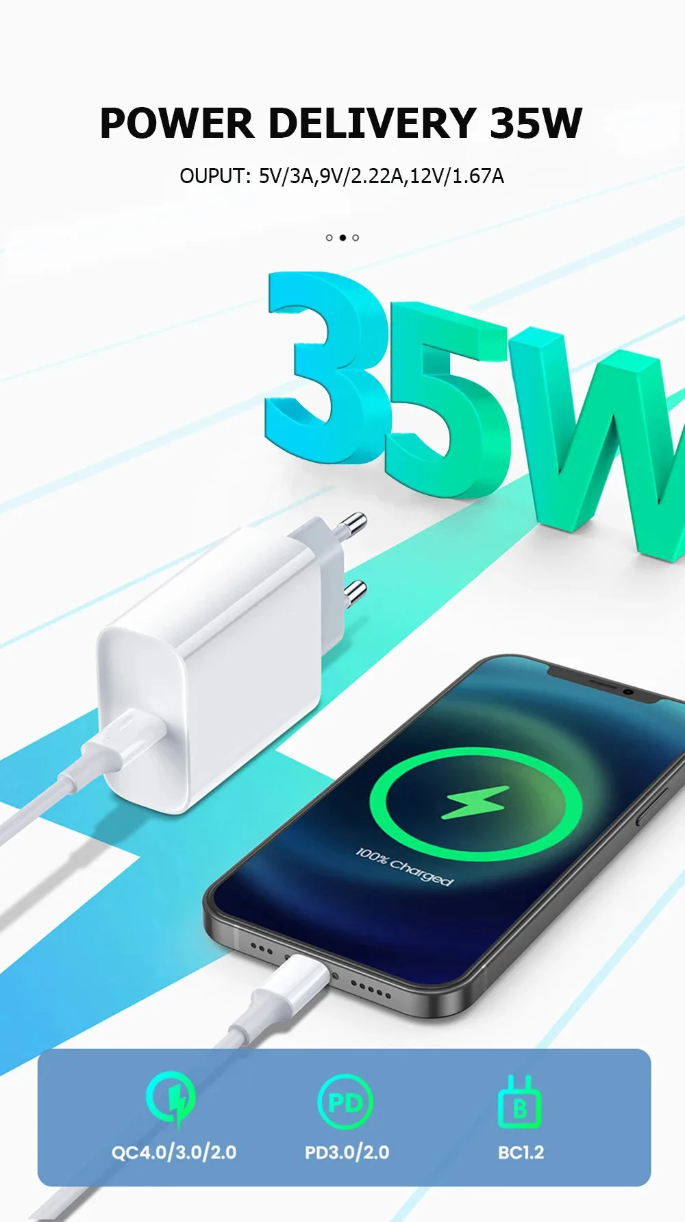 For Apple Original 35W Fast Charger For iPhone 14 13 12 11 Pro Max USB-C Quick Charging X XS XR 7 8 Plus Cable Phone Accessories